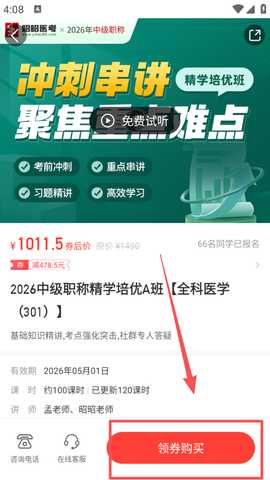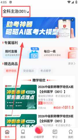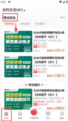 3、返回首页的精选商品区域,挑选适合你的医学课程班次。