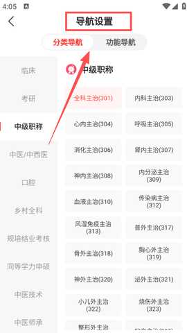 1、在软件首页,点击顶部的科目选项,例如“全科主治 (301)”,选择你需要的科目。 这将进入导航设置页面。