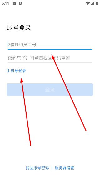 1. 在账号登录界面可以输入7位EHR员工号进行登录,也可以点击“手机号登录”切换登录方式。