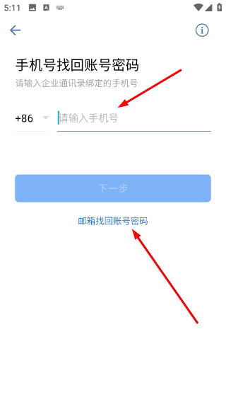 3. 进入手机号找回账号密码页面,输入已绑定的手机号,也可以点击邮箱找回账号密码来切换找回方式。