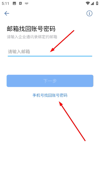 4. 在邮箱找回账号密码界面,输入绑定的邮箱地址,也可以点击手机号找回账号密码来切换找回方式。