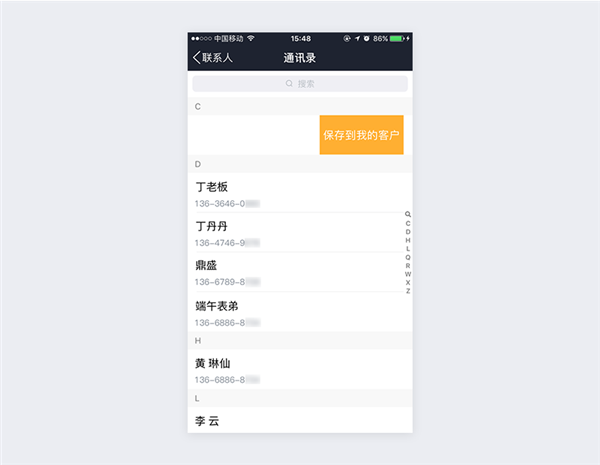 可以将本手机通讯录中的联系人通过电话号码左滑保存至客户库,如下图所示: