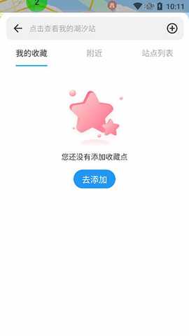 4、在我的潮汐站里一我的收藏、附近、站点列表, 没有添加收藏的可以点去添加。