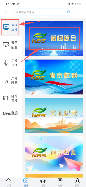 2、在「视听」页面中选择「电视直播」分类,然后点击「新闻综合频道」。