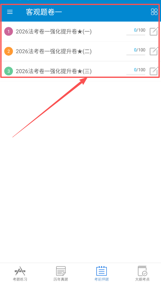 考前押题区域提供多套强化提升卷,这些模拟试卷专为考前冲刺设计,可在复习后期用来检验学习成果,提升应试能力。