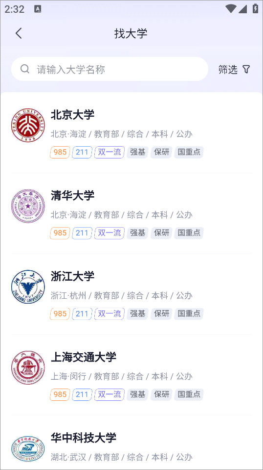 2、进入院校库后,能够利用多种筛选条件来定位目标高校。