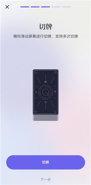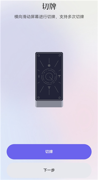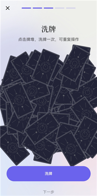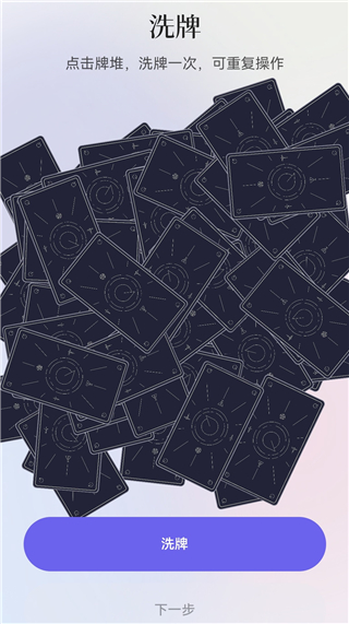 4、进入洗牌环节,点击牌堆即可完成一次洗牌,可多次操作,洗完后点【下一步】。