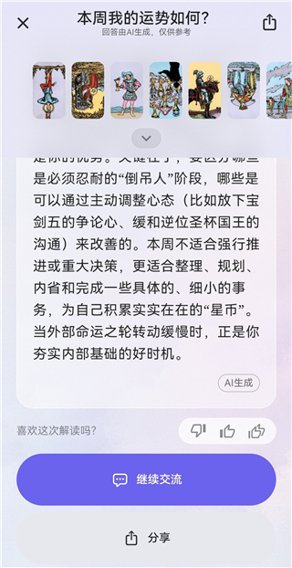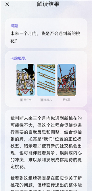 9、AI会依据你选出的三张牌进行解读,之后还可以继续提问更多问题。