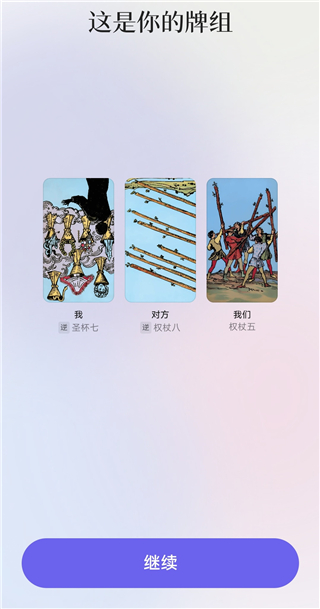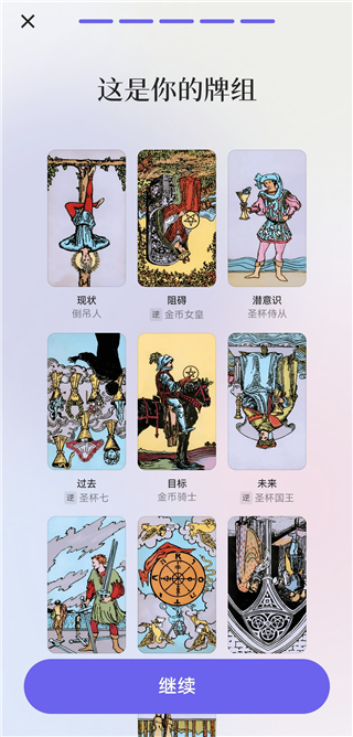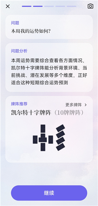 3、提交问题后,系统会进行解析并推荐合适的牌阵,然后点击【继续】。