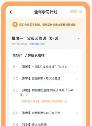 按周解锁内容:每个模块按周更新学习内容,周一至周五每天会解锁相应的学习资料。
