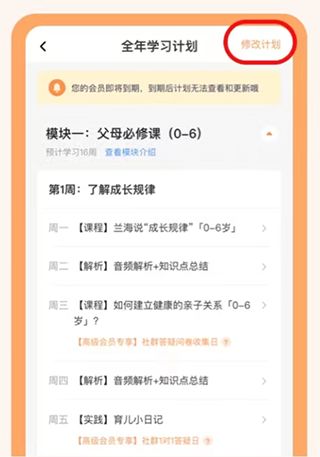 若您所选模块的学习计划已全部更新完成,可直接进入学习计划页面,点击右上角的【修改计划】按钮,重新制定学习计划。