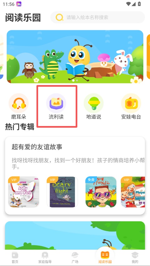 1、打开安妮花App,点击底部导航栏的「阅读乐园」,进入后选择「流利读」模块;