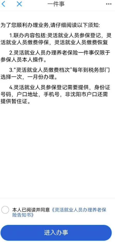 仔细阅读业务办理须知,勾选“本人已阅读并同意《灵活就业人员办理养老保险告知然后点击“进入办事”图标,选择“灵活就业人员参保登记”,再点击“确定”。