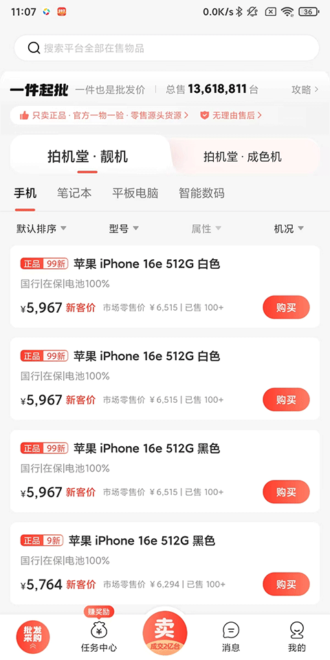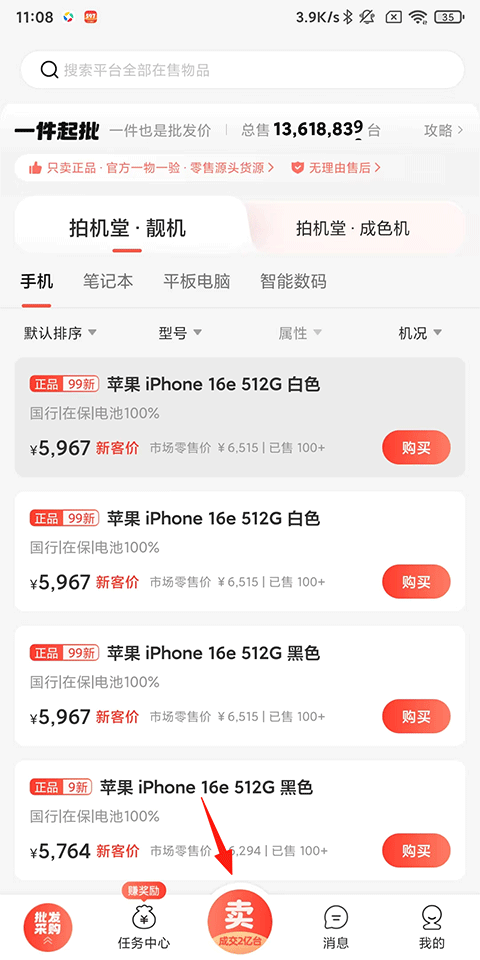 打开拍机堂 APP,点击屏幕正下方醒目的“卖”按钮。