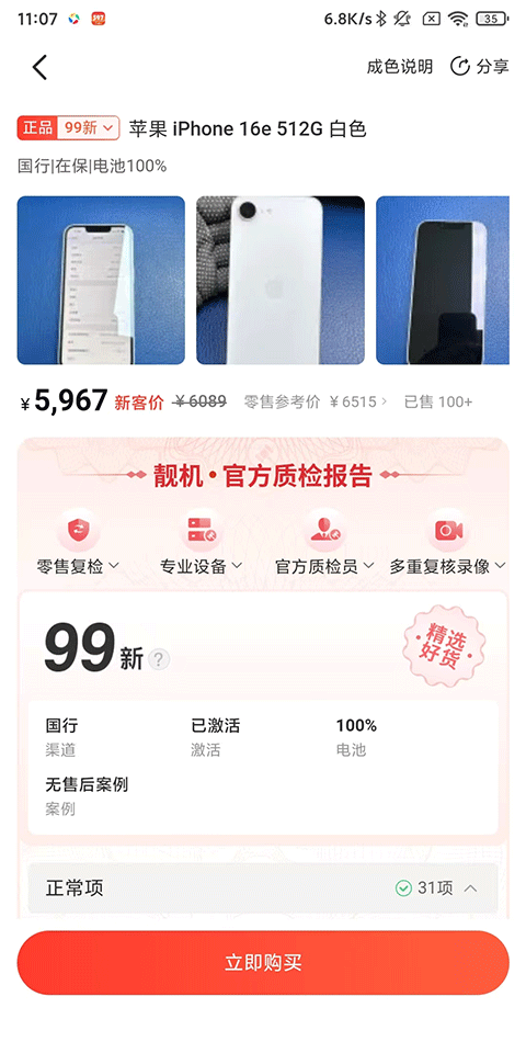 仔细查看官方验机报告以及手机的成色图片,确认各项信息无误后,点击“立即购买”按钮。