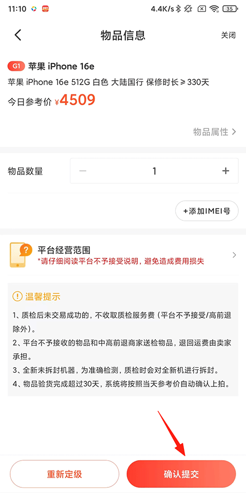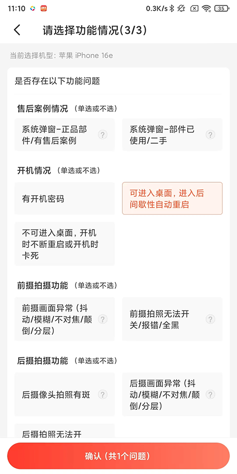 接着如实填写设备的使用情况、功能状况、外观成色等信息,填写完成后点击“确认”。