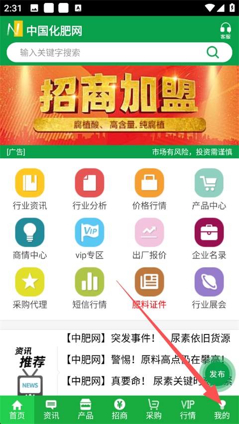 1、打开中肥化肥网App首页,点击底部导航栏最右侧的"我的",进入用户中心;