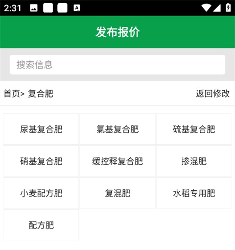 4、进入细分品类页,选择具体产品类型(如水稻专用肥、尿基复合肥等),进入发布报价页;