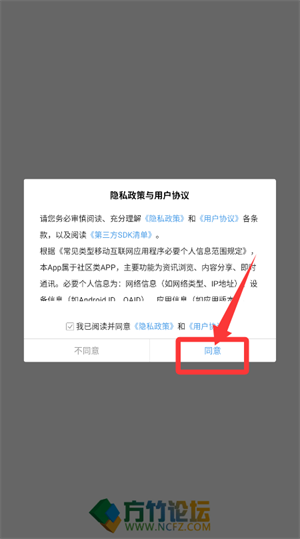 启动后,确认隐私协议内容,点击“同意”按钮以继续使用。