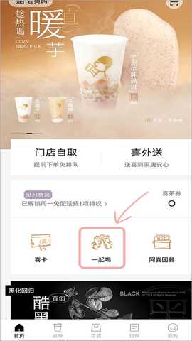 1、首先进到喜茶go app,在首页选择“一起喝”