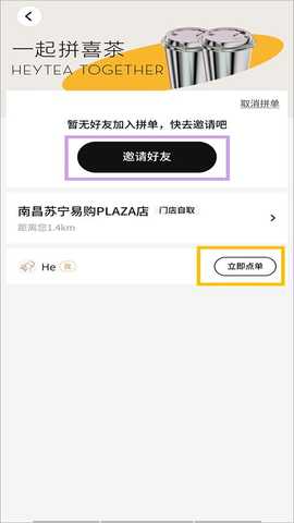 3、点击“立即点单”选好你要拼单的饮品,点击“立即邀请”将拼单请求分享发给你的好朋友,对方打开链接即可进行拼单啦。