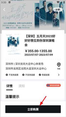 3、进入购票详情,可查看演唱会主题、地点、时间、演出详情等,点击立即购票。