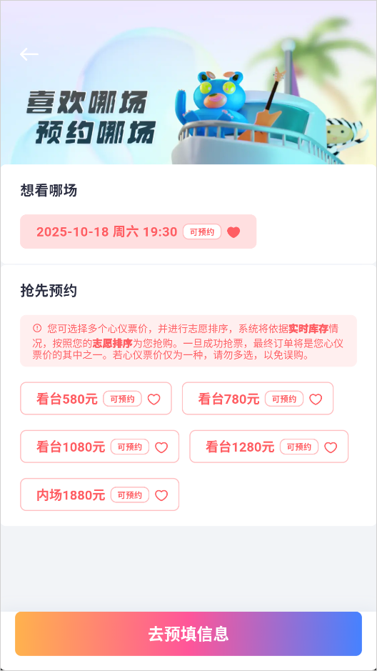 若支持预约抢票,提前点击【预约抢票】并选择场次、票品,预填信息后保存。