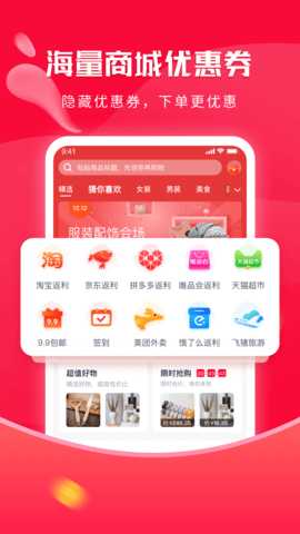 2. 浏览首页,查看各类优惠券和返利活动,选择感兴趣的商品。