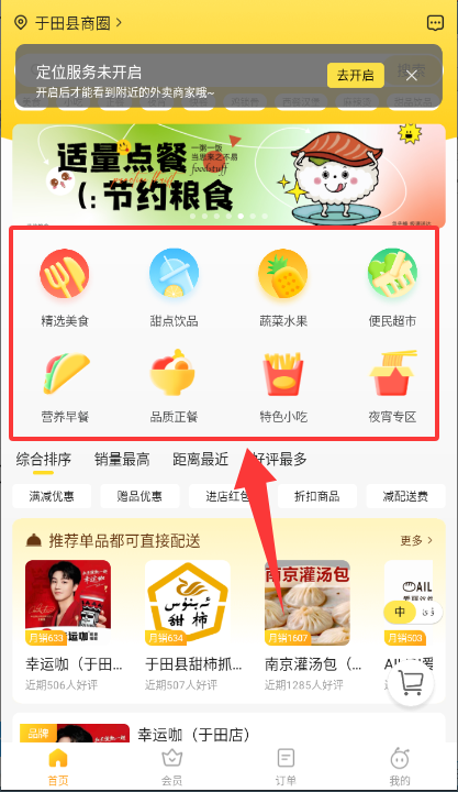 能看到精选美食、品质正餐、特色小吃、夜宵专区、营养早餐、蔬菜水果、甜点饮品、便民超市等分类。
