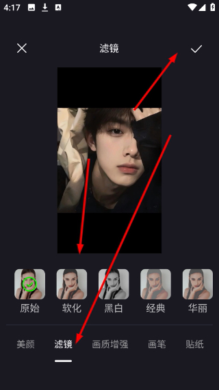 3、在滤镜界面选择喜欢的滤镜效果,完成后点击右上角的对勾保存当前设置。