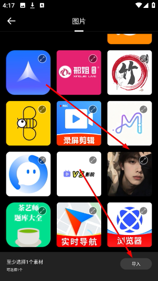 2、进入素材选择界面选中目标图片后,点击导入按钮即可将素材添加至编辑项目中。