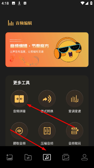 4、进入音频编辑界面点击底部音乐图标,可使用音频拼接等多种音频处理工具。