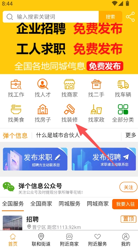 打开应用首页,点击“找装修”选项,进入对应的服务页面。
