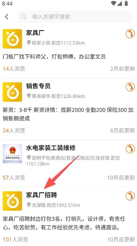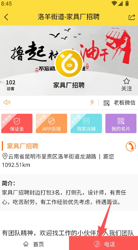点击进入目标条目的详情页面,仔细浏览相关信息后,点击电话按钮与相关装修主体取得联系。