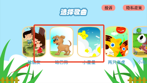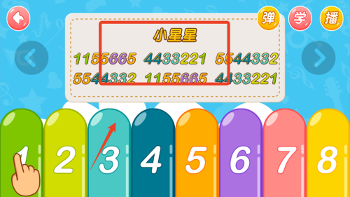 学习简单儿歌:选择歌曲后,观察落点提示,按照节奏依次点击对应颜色的琴键完成演奏。