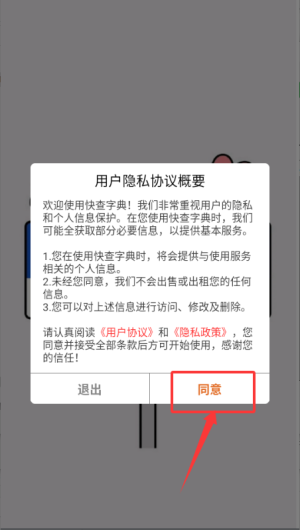 在快查字典应用中,点击“同意”隐私协议,随后即可进入功能选择界面。