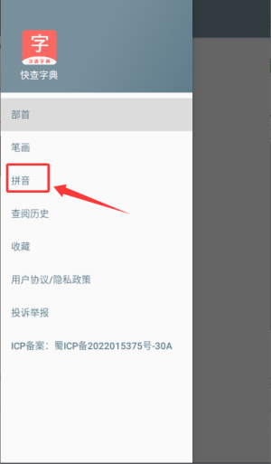 在功能选择界面中,选择拼音分类栏目,进入汉字查询页面。