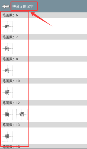 在汉字查询页面,可查看以目标拼音开头的汉字列表及其对应的笔画信息。