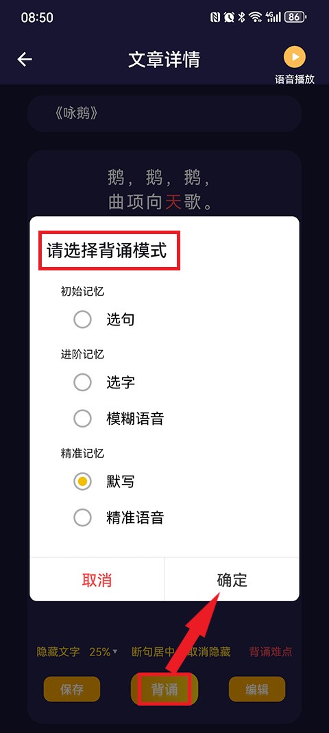 背诵:熟悉文章后,点击下方的“背诵”按钮,选择好背诵模式后点击确定即可。