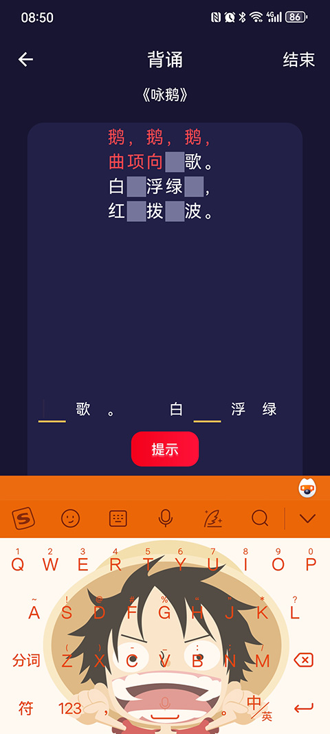 开始背诵:可以开始背诵了,在背诵过程中遇到困难时,可以点击下方“提示”查看部分提示内容。