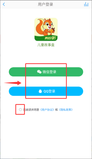 在登录界面勾选《用户协议》和《隐私政策》复选框,选择微信/QQ第三方账号快速登录。