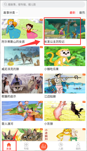 登录成功后进入故事专区,找到《长发公主历险记》封面图,点击进入全屏播放界面。