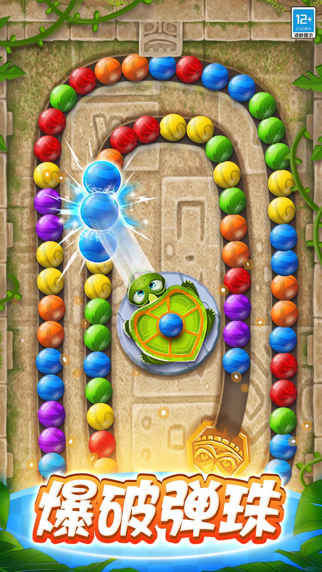 3. 发射彩珠:通过点击屏幕选择发射方向,发射与轨道上相同颜色的彩珠进行消除。