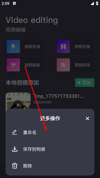 2、在视频列表打开更多操作菜单,可选择重命名保存到相册或删除等管理操作。