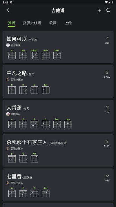 2. 丰富的吉他谱资源软件内拥有海量吉他谱,包括弹唱谱、六线谱,涵盖各种风格和难度,满足不同用户的学习需求。