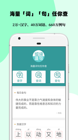 2、丰富的内容:除了基本的造句功能,应用还提供了名人名言、课文例句、诗词和古文等多种类型的例句,满足不同用户的需求。