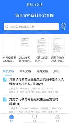 3. 搜索资料在首页的搜索框输入关键词,点击搜索按钮,浏览相关文档列表。