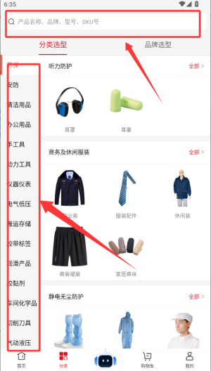 选择分类或搜索:来到主页后,点击底部的分类进入产品分类页面,在左边选择相应分类;