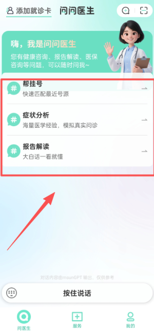 登录成功后,即可使用问医生、帮挂号、症状分析等功能,长按“按住说话”按钮可进行语音咨询。