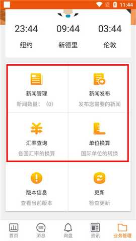 7、点击进入业务管理,头像下面能够看到三个国外地区的时间,时刻关注;